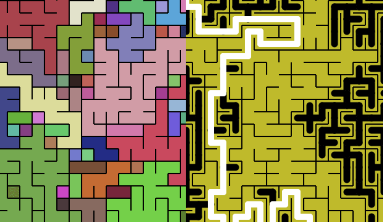 This is a maze generator using something fancy called a Union-Find algorithm. To see it run, just press the "AMAZE" button, sit back, and wait for... a maze. The individual cells are joined into a 'forest' of larger and larger trees, until they're all one giant tree which means every cell can be reached by every other cell.